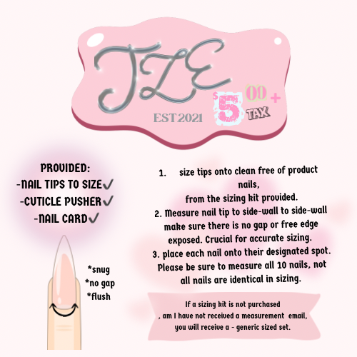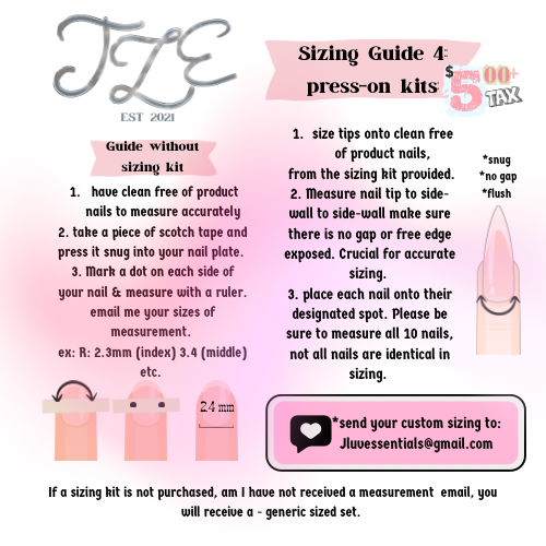 Designed to help each luvie achieve the utmost flush, fit & comfotable press-ons. Be sure to SIZE ALL 10 NAILS. You are responsible for the numbers you select for sizing. I will begin your set once the sizes are emailed back to me.